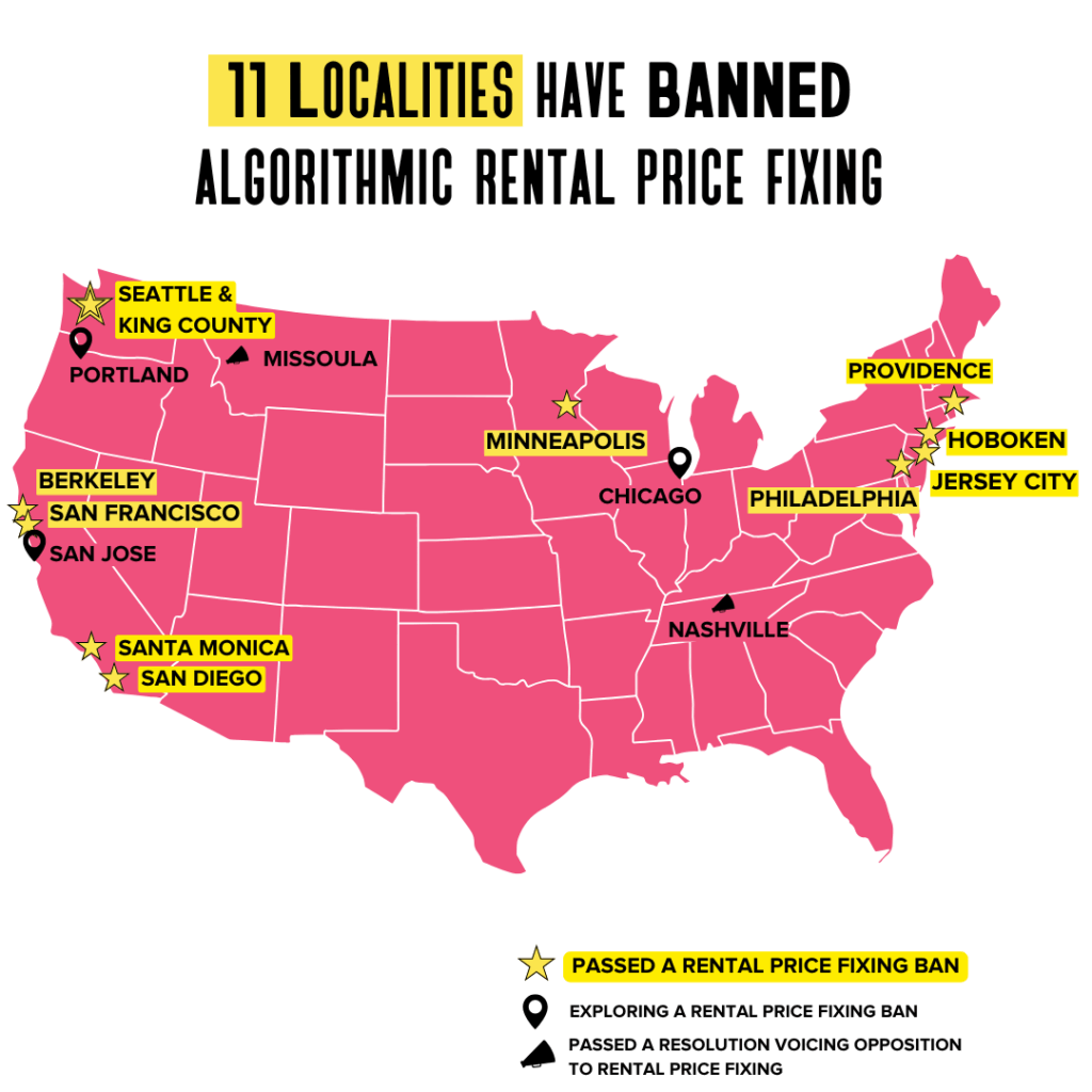 San Francisco, Berkeley, Philadelphia, Minneapolis, San Diego, Jersey City, Providence, Santa Monica, Hoboken, Seattle, and King County have all passed legislation banning landlord collusion through price-fixing algorithmic systems—one important first step—and Portland, Chicago, and San Jose are taking steps to regulate algorithmic rental price fixing in their communities. Nashville and Missoula have each passed resolutions voicing opposition to rental price fixing, with Nashville also calling for an investigation into the practice.